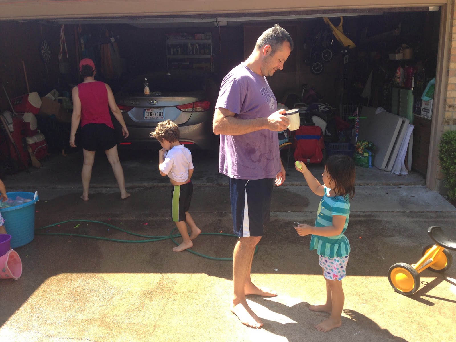 Hooray daddy showed up today! He surprised us while we were having breakfast and we were very excited to see him. Of course after the initial joy we were distracted by other things. But eventually we got to spend some time brushing daddy's hair. We also prepped for tomorrow's party by blowing up a bunch of water balloons. We showed daddy how excited we were with water balloons that had a tiny hole and how we would drink water from the hole. We hopped into the pool and sang some spaghetti songs. We went out to Chili's for dinner as a family. It was super fun. Of course we were exhausted but we read some books with daddy and fell asleep.